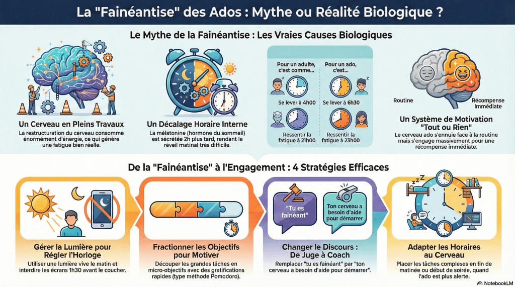 Le cerveau adolescent consomme une quantité massive d’énergie pour sa restructuration (élagage des connexions inutiles). Cette dépense métabolique, couplée à la poussée de croissance physique, génère une fatigue réelle que le corps compense par des périodes de repos qui semblent excessives à l’observateur extérieur.